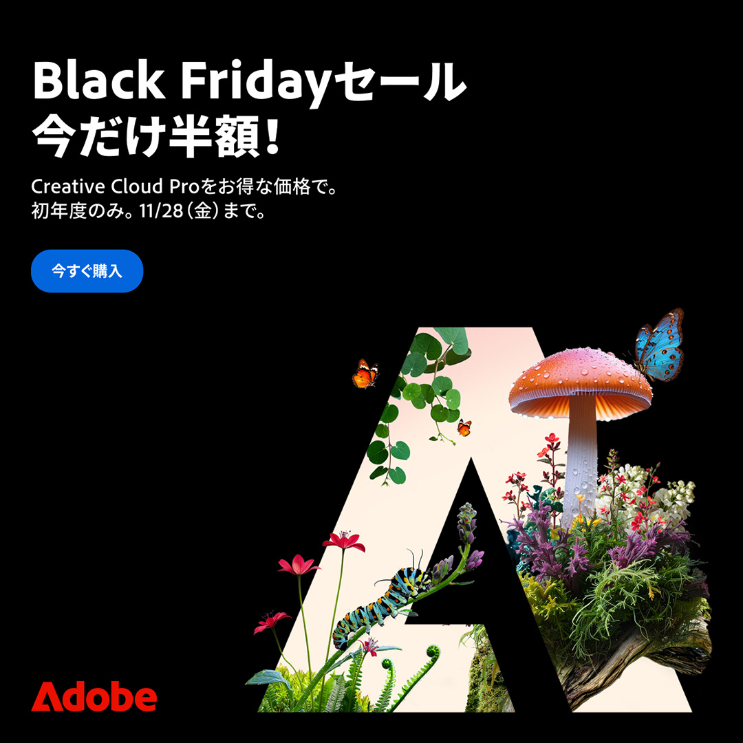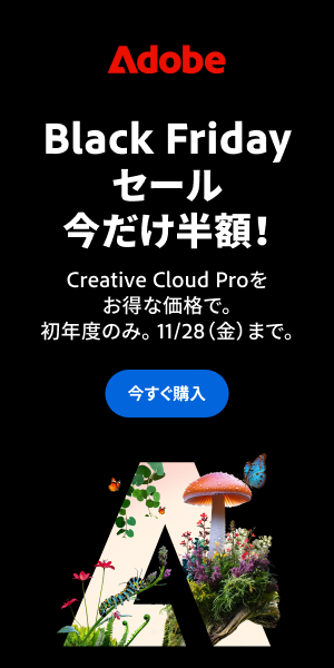 当記事は広告を含みます Adobeアドビ では 11月14日(金)より、Black Friday Sale 2025 を開催している。 期間限定で Creative Cloud の各種プランを割引価格で購入できる。アドビ にて Black Friday Sale 2025 が期間限定で開催中だ。 Creative Cloud の各種プラン料金の支払いが、初年度 12ヶ月間 50%引きで利用できるセールで、今回初めて Adobe Firefly プランもセール対象に加わった。 セール期間は...