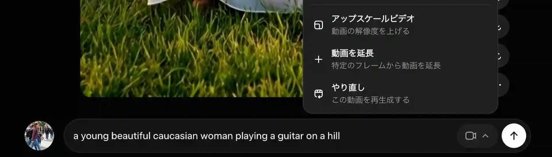 使い方は、生成した動画のプロンプトバー右下に表示される動画アイコンから "動画を延長" を選択する。