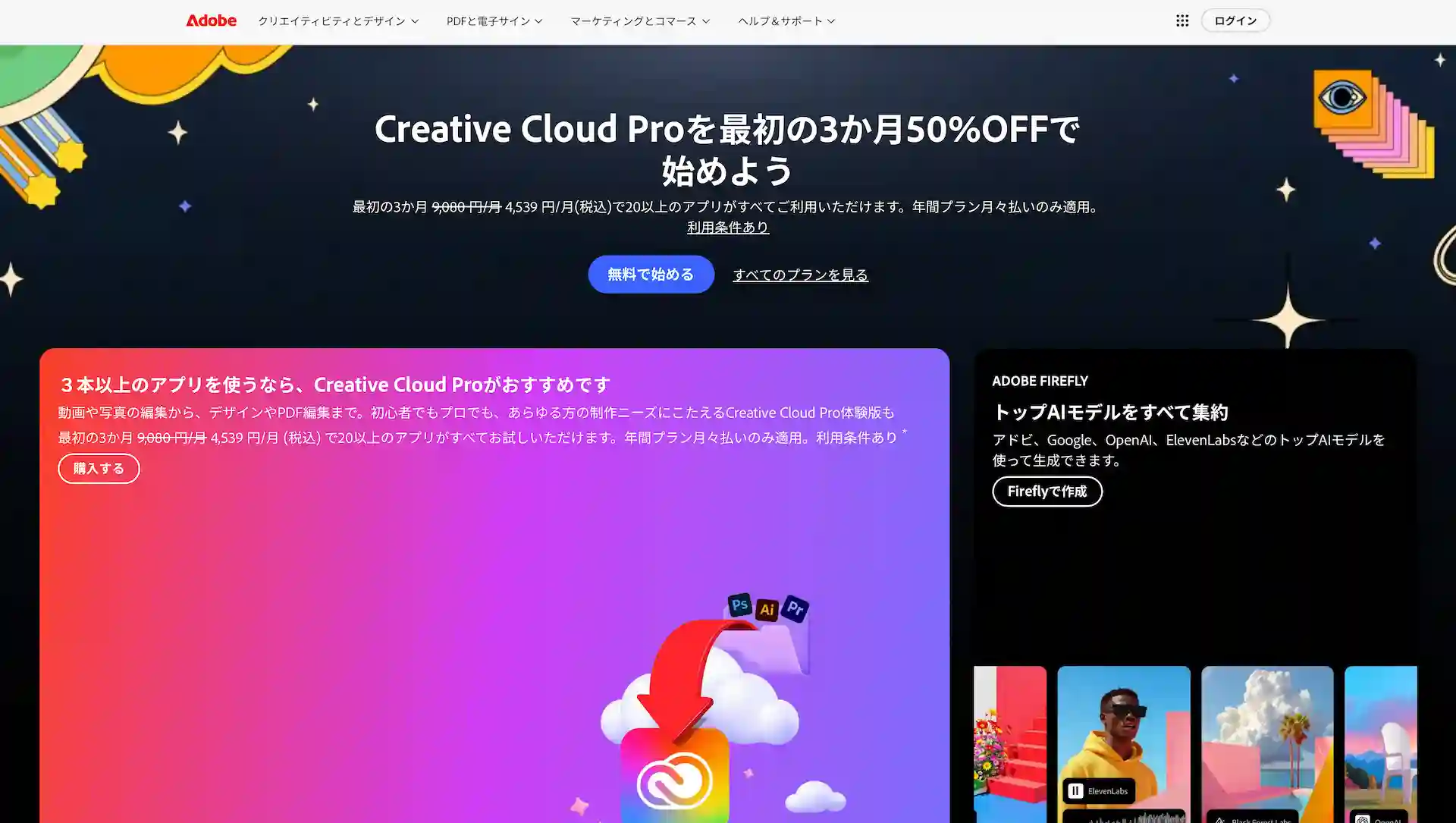 初めて Adobe を利用するユーザーを対象に、プラン料金を初年度12ヶ月間セール価格で利用できます。